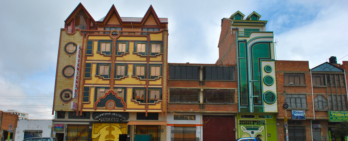Once the only visit to El Alto for tourists would have been to and from the airport that serves La Paz with perhaps a photo stop at the magnificent roadside viewpoint to see the cityscape below. Today, the newly-forming identity of El Alto offers more for the adventurous. Much of this identity stems from the various public and private buildings proliferating as examples of the 'new Andean' cholet architecture, with their brash, bold colours and extravagant videogame-like designs based on ancient pre-Inca motifs.