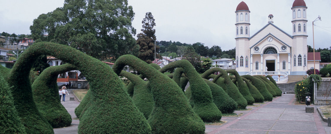 Grecia's church is made entirely of iron - a novel approach inspired by the fate of its predecessor, which burned down. Individual sheets were forged in Belgium and bolted into position in the early 1890s. Neighbouring Sarchí is a centre of folk art. Souvenirs in its many shops show the colourful kaleidoscopic designs that were traditionally painted on ox-carts. The most elaborate convey the bride and groom from church. The designs can be traced to settlers from Andalucía. Zarcero's town square is jam-packed with topiary clipped into arches which makes for a surreal photo stop.
