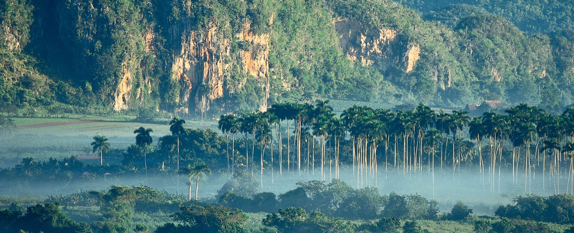 The Cuban national tree, the Royal Palm, is everywhere and gardens grow bananas and other fruits in abundance. Flaming flamboyán trees, purple bougainvillea and red hibiscus stand out against fields bursting with the vibrant green of tobacco flourishing on the rich soil.