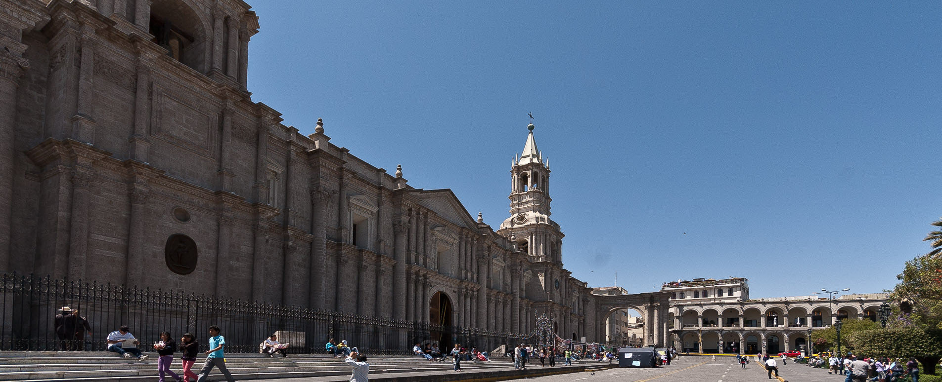 The majestic Basilica Cathedral dominates the whole of one side of the plaza, with Misti volcano looming behind it.