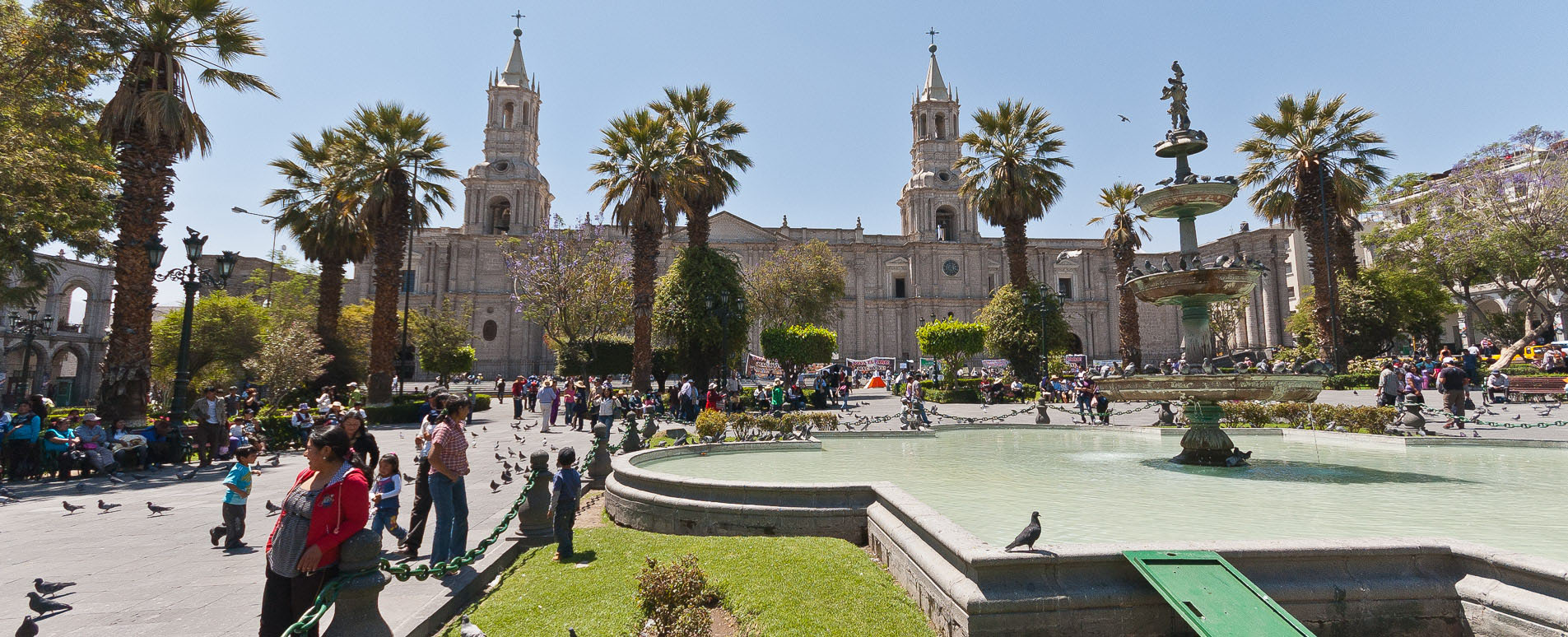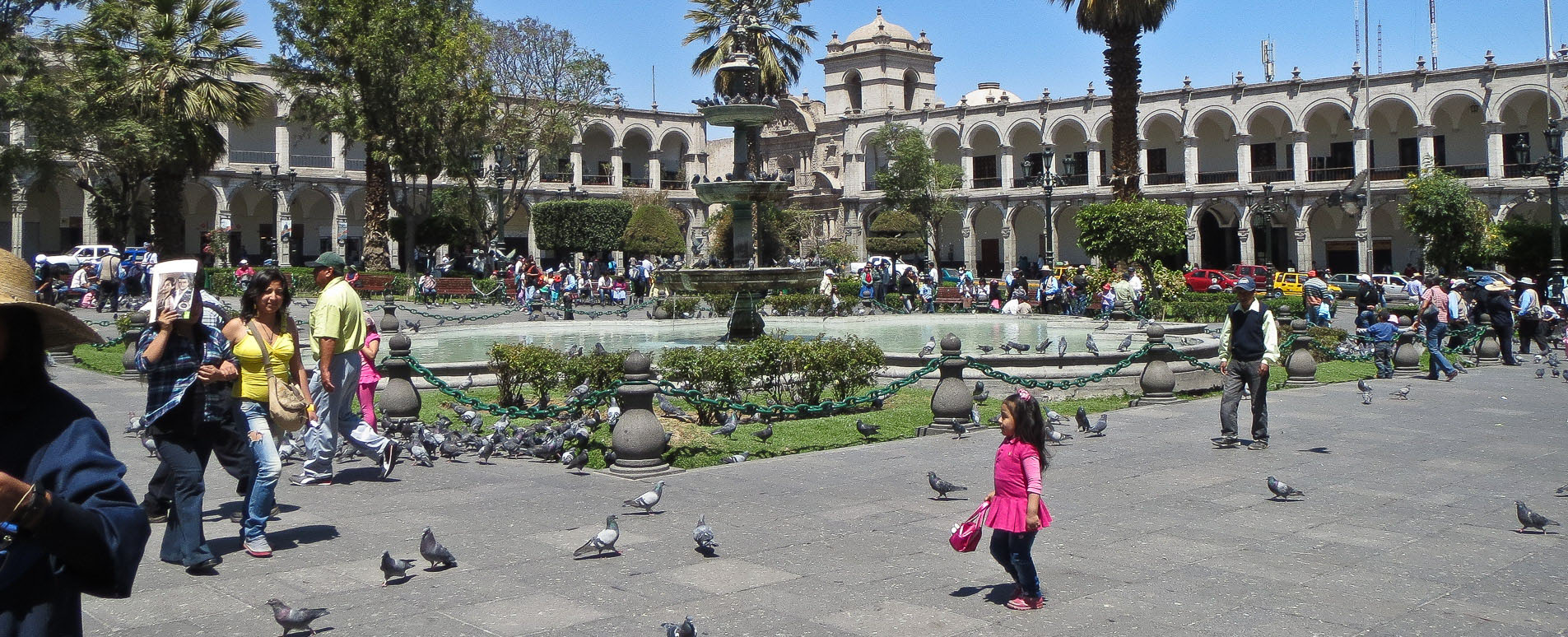 As with all important Peruvian cities, there is a very grand main square. Shaded by palm trees, cooled by fountains, provided with paths to stroll on and benches to chat on, the Plaza de Armas is a theatre for Arequipeño-watching.