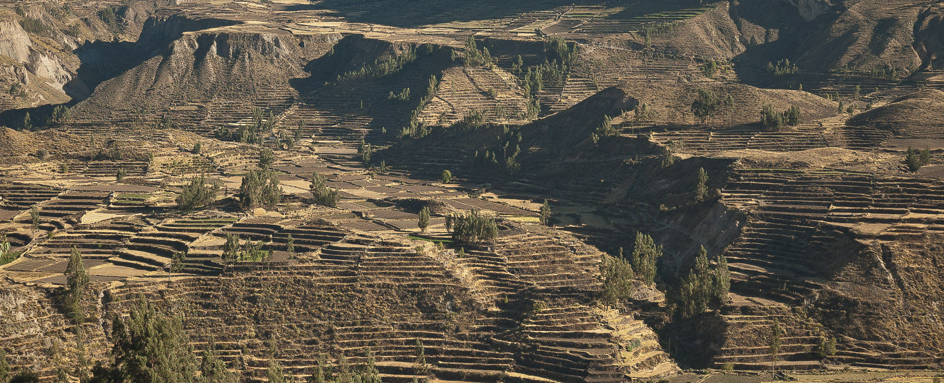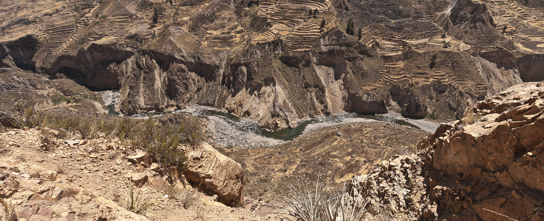 Twice as deep as the Grand Canyon, the Colca Canyon begins gently. A wide valley opens out below the mountain town of Chivay, decked with layer on layer of terracing dating back to pre-Incan times and still actively used. A mountain river speeds along as the valley widens and slowly deepens, with farms and hamlets either side, some with pretty churches glistening white.