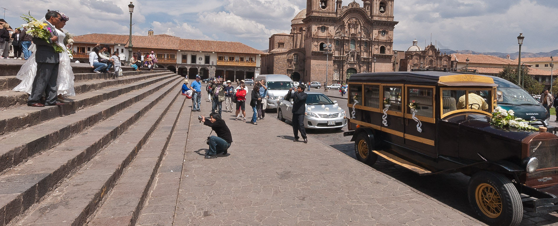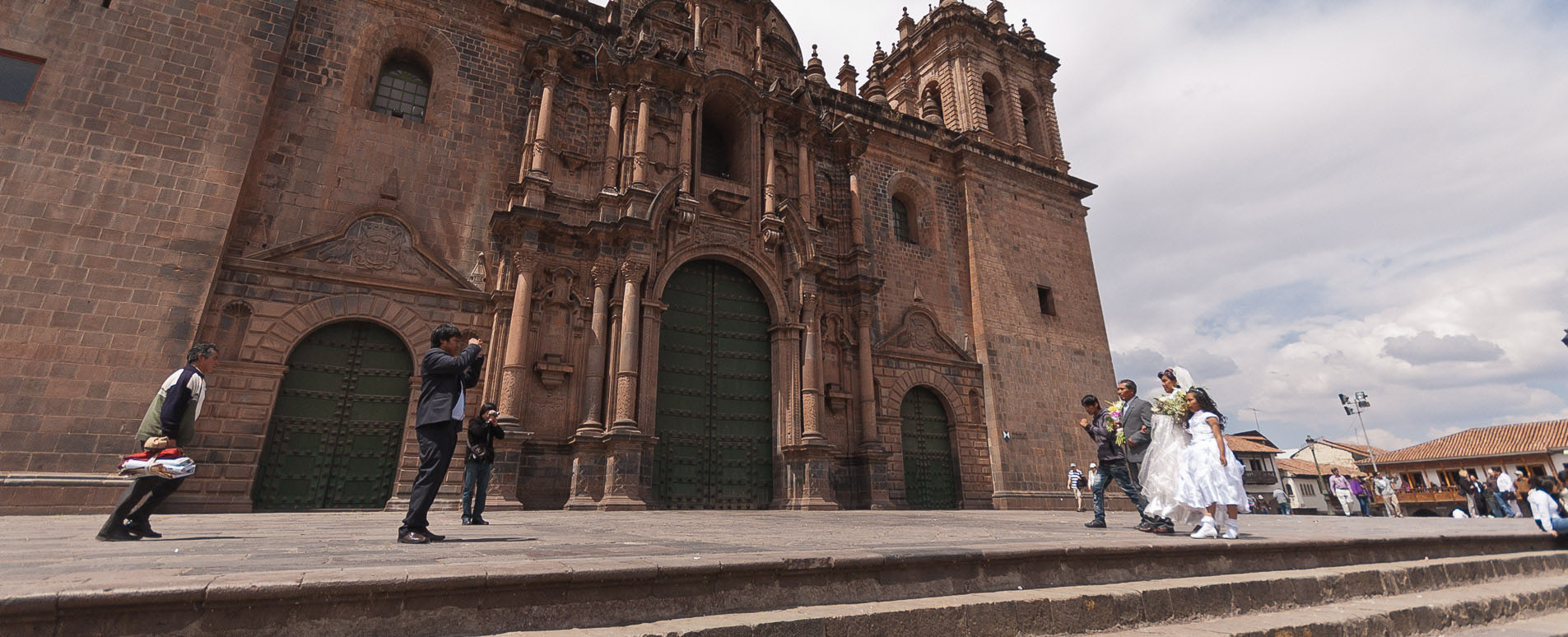The main square, called the Plaza de Armas as always in Peru, stands on the site of the Inca's central plaza below the ruins of Saqsawaman. Here newly-weds come from around the city to stand on the steps of the Cathedral for their photographs.