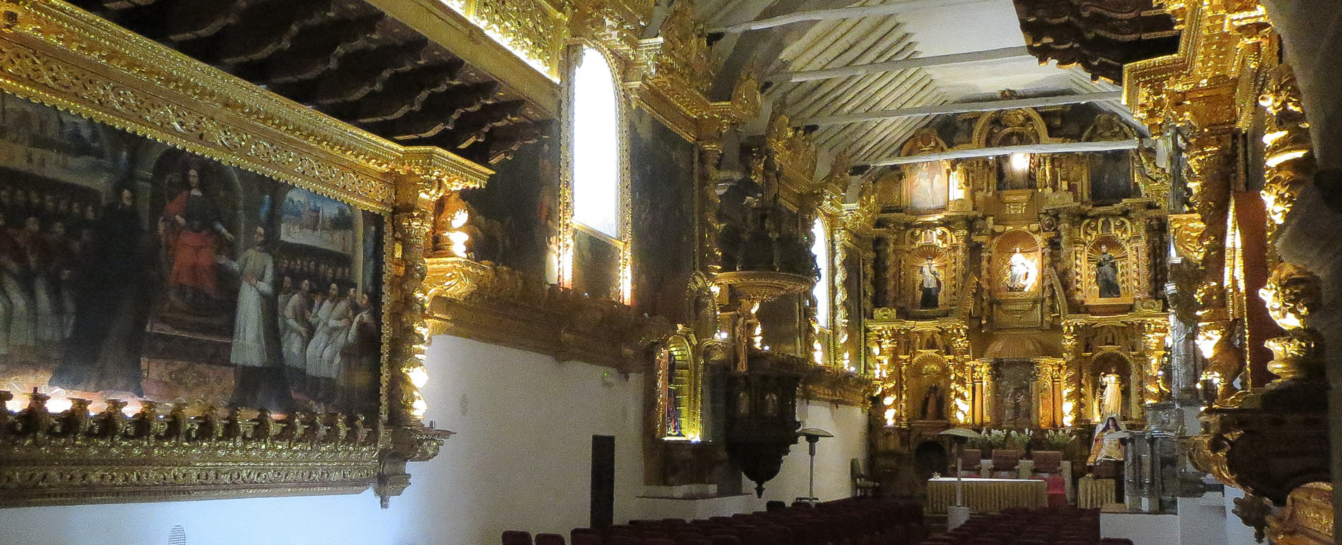 Standing on the foundations of an Inca's palace, Cusco's great Cathedral is both a grand statement of the power of Spain and the church, and an assimilation of local beliefs. The massive main door, carved with a jaguar's head, opens to a vast baroque interior. A wide nave leads to an altar made with 400kg of silver. Of the many paintings only a few are European (including a Van Dyck), others are by local artists of the Cusco school, including a grand depiction of the Last Supper with apostles tucking into roast guinea pig and chicha beer.
